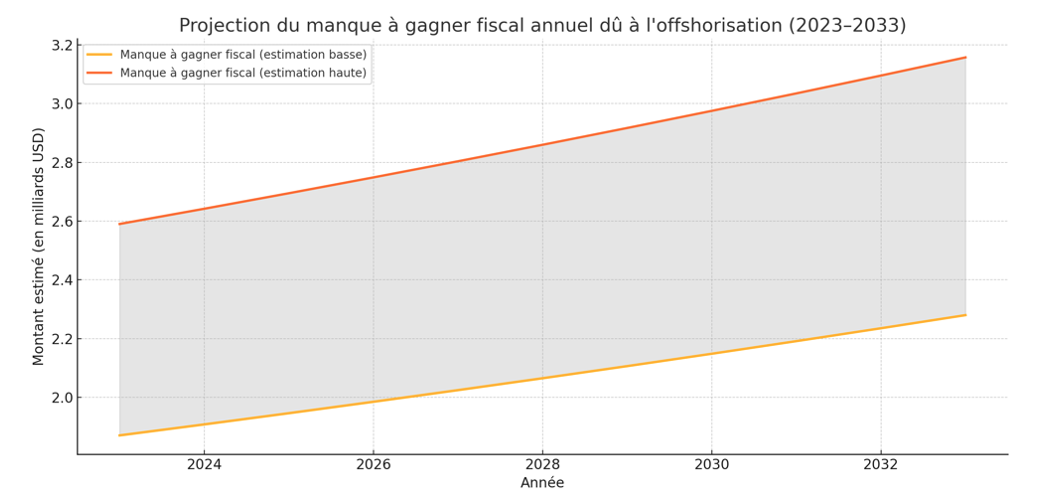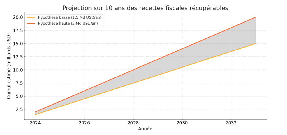 | Année | Hypothèse basse (1,5 Md USD/an) | Hypothèse haute (2,0 Md USD/an) |