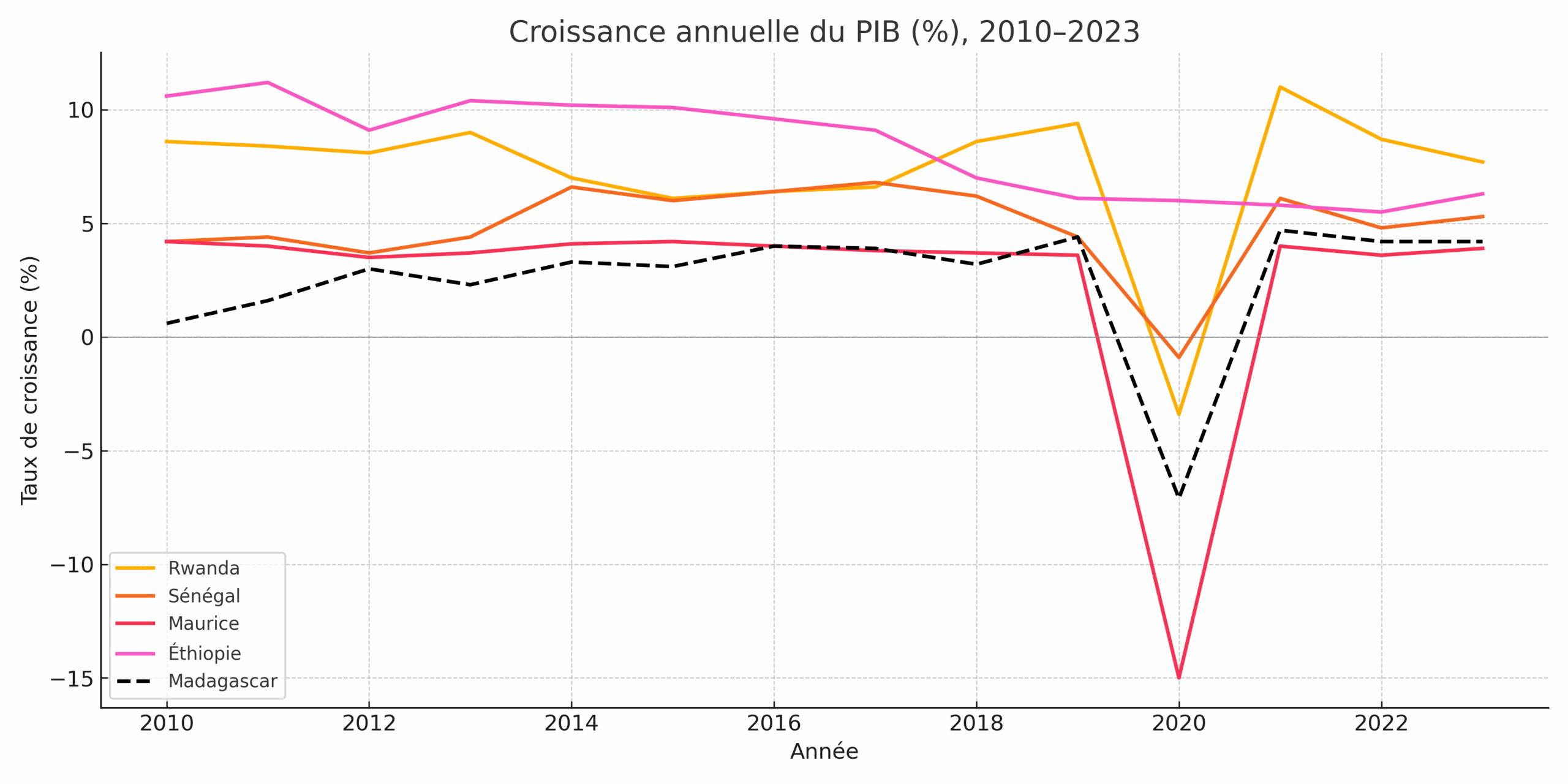 Entre 2010 et 2023, le Rwanda a affiché une croissance moyenne de 7,4 %, avec une baisse en 2020 (-3,4 %) suivie d’un fort rebond (+10,9 % en 2021), démontrant sa résilience institutionnelle.