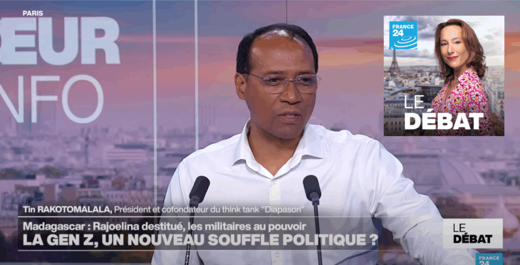 Mercredi 15/10/25 – 19:10 🎥 Replay de l’émission « Le débat » Diapason est invité à décrypter l’actualité de Madagascar sur France 24, dans un contexte marqué par l’éveil de la Génération Z, la crise institutionnelle et les transformations en cours sur le continent. 📺 Notre intervention a porté sur le sens profond de ce moment historique : non pas une simple crise politique, mais un tournant générationnel et sociétal. Une jeunesse qui ne réclame pas un miracle, mais un État juste, digne et connecté à la réalité du pays. 👉 Comprendre le réel, avant les récits. C’est la mission de Diapason. – Nourrir le débat – Sources : France 24 #France24 #ledebat #Afrique #Diapason_Think_Tank #Madagascar