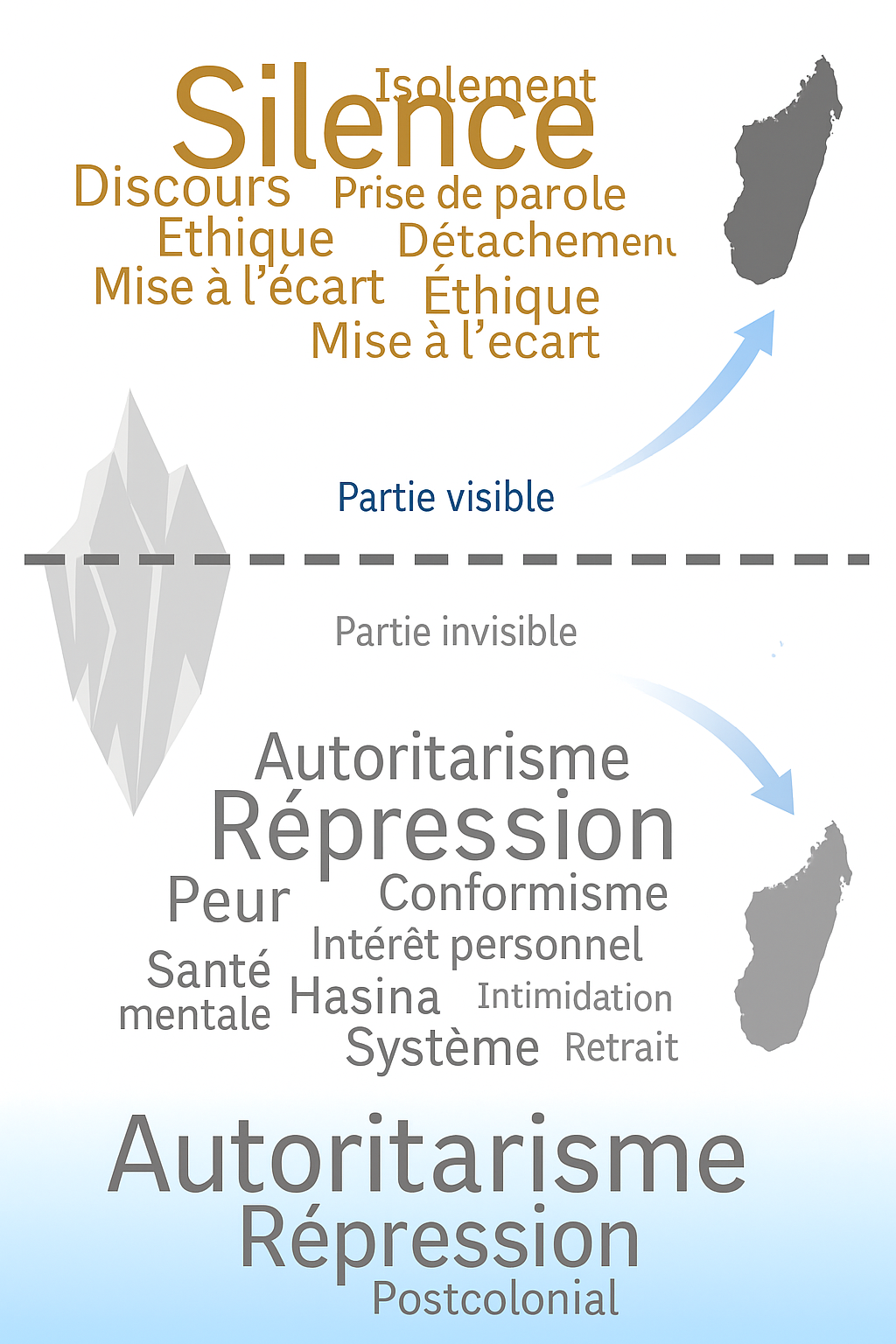 | Discours sur l’éthique du silence, du retrait, du discernement | Absence de cadre collectif de reconnaissance du Hasina (autorité morale légitime) | Choix de la gouvernance | Désenchantement | Érosion de la sphère publique comme lieu de délibération libre |