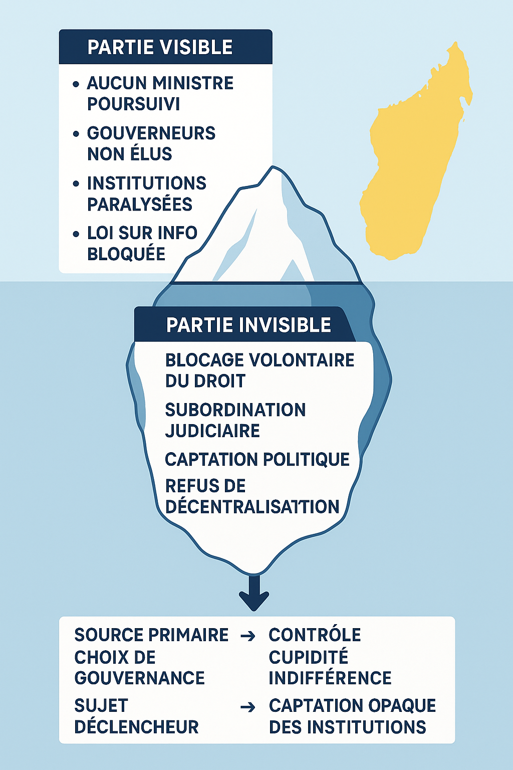 L’analyse ICECAP (Iceberg Causal Analysis Protocol) illustre le décalage entre ce qui est visible, l’inaction, les blocages, et ce qui est invisible : la captation des institutions, la subordination des juges, le verrouillage des textes.