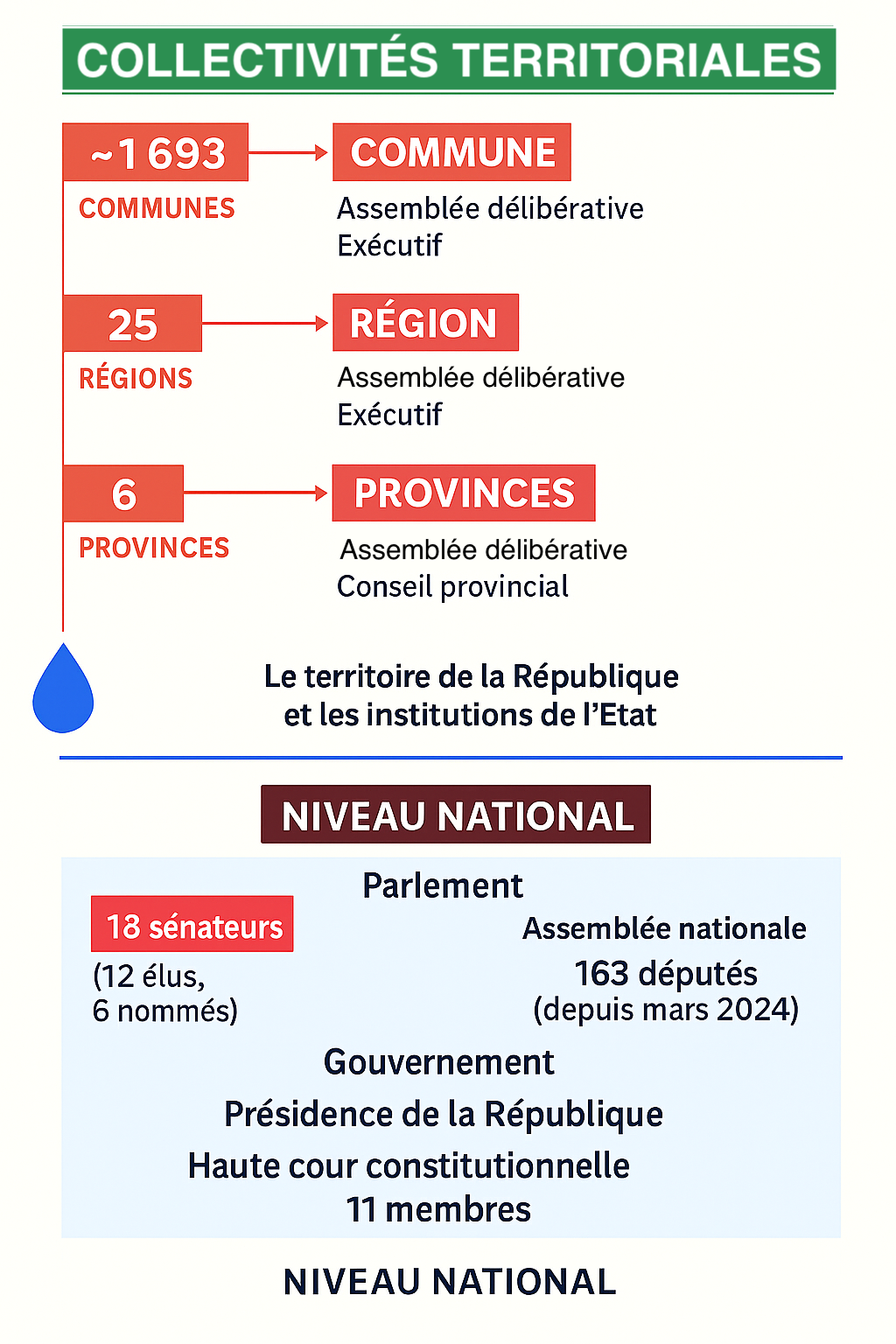 L’architecture institutionnelle de Madagascar repose sur quatre niveaux hiérarchisés : les communes (1 693 environ), les régions (25 depuis 2023), les provinces (6 restantes), et l’État central. À chaque étage, la Constitution prévoit des organes délibératifs (assemblées) et des chefs exécutifs élus.
